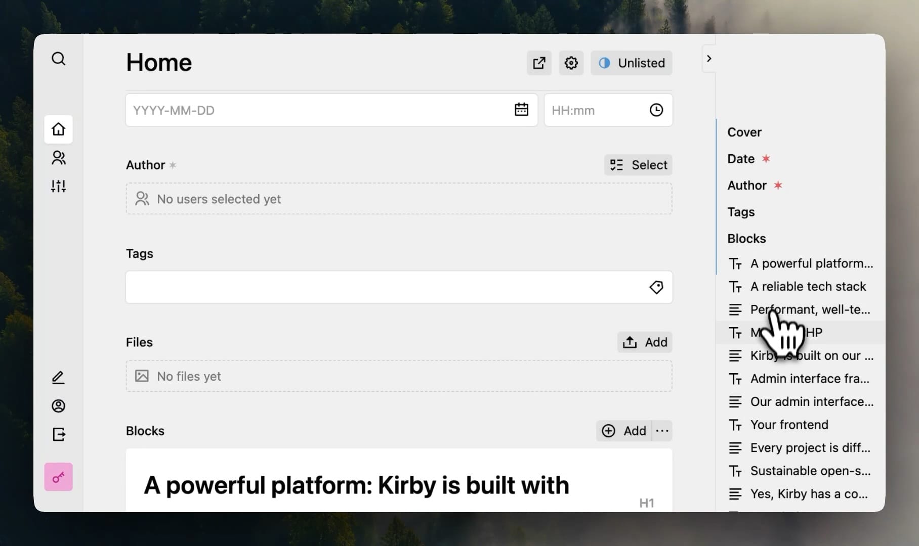 Need something specific? We are experienced with Kirby plugins, especially Panel plugins. We can tailor new plugins to your needs. Just drop us a line!